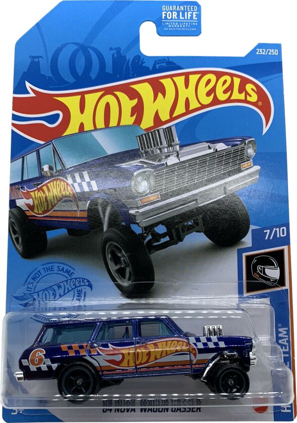 GTD06 is part of the 2021 Super Treasure Hunt set, 232/250 in the mainline set, and 7/10 in the HW Race Team series. It is Spectraflame blue decorated with orange and white stripes along with checkered patterns. A large Hot Wheels logo is featured on the sides and “6” is also on the sides. “TH” can be found on the roof. The car has blue tinted windows, a chrome interior, 5-spoke Real Rider wheels with grey rims, and a black plastic Malaysia base. This vehicle can be found in mix “P” of 2021 Hot Wheels mainline cases. The '64 Nova Wagon Gasser made its debut in the 2019 HW Race Day series. It is based upon a Chevy Nova station wagon that has been modified with a lifted front end, large air intakes, and a massive engine.