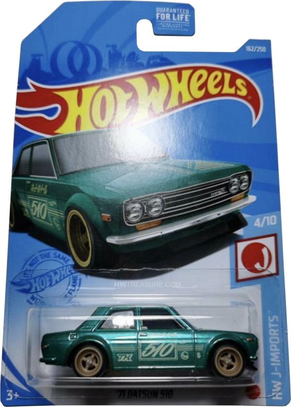 GTD04 is part of the 2021 Super Treasure Hunt set, 162/250 in the mainline set, and 4/10 in the HW J-Imports series. It is Spectraflame teal detailed with white graphics and stripes. “Datsun” with a checkered pattern is on the hood and “510” with the Hot Wheels logo is on the roof and doors. “TH” can be found on the sides and trunk. The car has tinted windows, a black interior, 4-spoke Real Rider wheels with tan rims, and a black Malaysia base. This vehicle can be found in mix “H” of 2021 Hot Wheels mainline cases. The Datsun Bluebird 510 made its debut in the 2009 New Models series. It is based upon the car that was sold from 1968 to 1973. It was known for being affordable, reliable, easy to repair, and easy to upgrade.