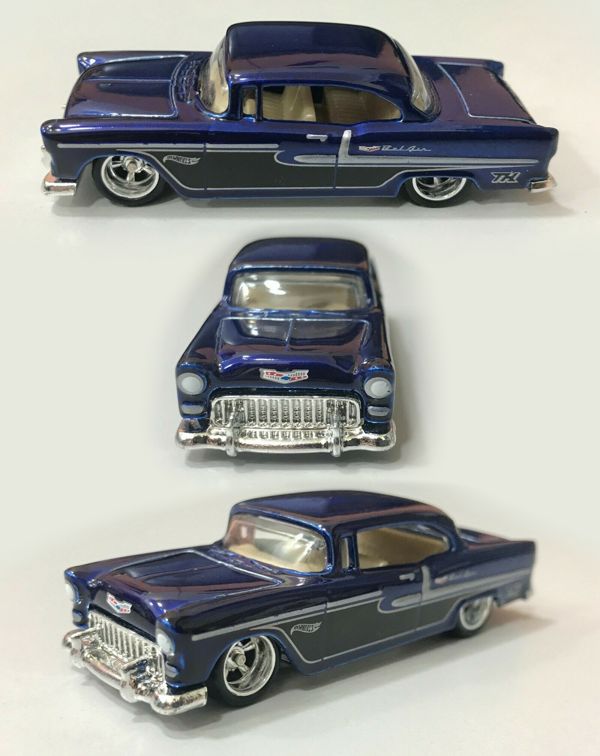 The '55 Chevy is part of the 2022 Super Treasure Hunt set. It is Spectraflame blue with black and silver details. A Chevrolet emblem decorates the front and sides. Also on the sides are the Hot Wheels logo and “Bel Air”. “TH” can be found on the rear fender panels. The car has clear windows, a tan interior, Real Rider wheels, and a chrome plastic Malaysia base. This vehicle can be found in mix “A” of 2022 Hot Wheels mainline cases. The '55 Chevy made its debut in the 2006 Classics 2 series. It was previously a regular and a super T-Hunt in 2009.