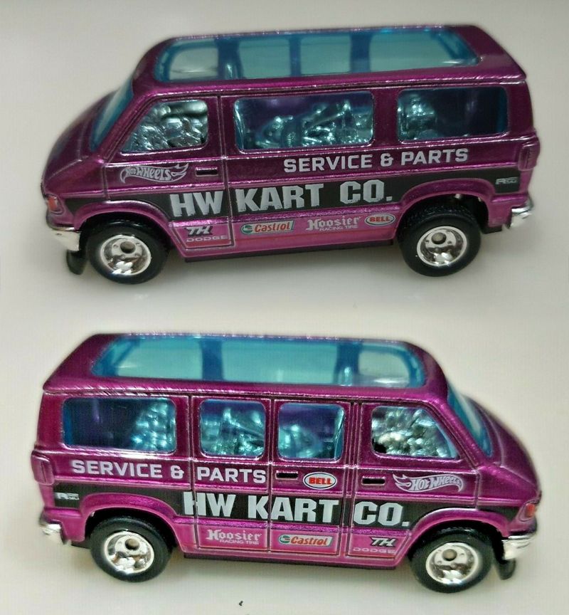 The Dodge Van is part of the 2022 Super Treasure Hunt set. It is Spectraflame purple with “HW Cart Co.” in a black stripe on the sides. “Service & Parts”, the Hot Wheels logo, “TH”, “Dodge” as well as logos for Castrol, Hoosier Racing Tire, and Bell are also on the sides. Details include blue tinted windows, a chrome interior, Real Rider wheels, and a black plastic Malaysia base. This vehicle can be found in mix “B” (?) of 2022 Hot Wheels mainline cases. The Dodge Van made its debut in the 2021 HW Drift series. It is based upon the third generation of the Dodge B series van that was produced from 1994 until 2003.